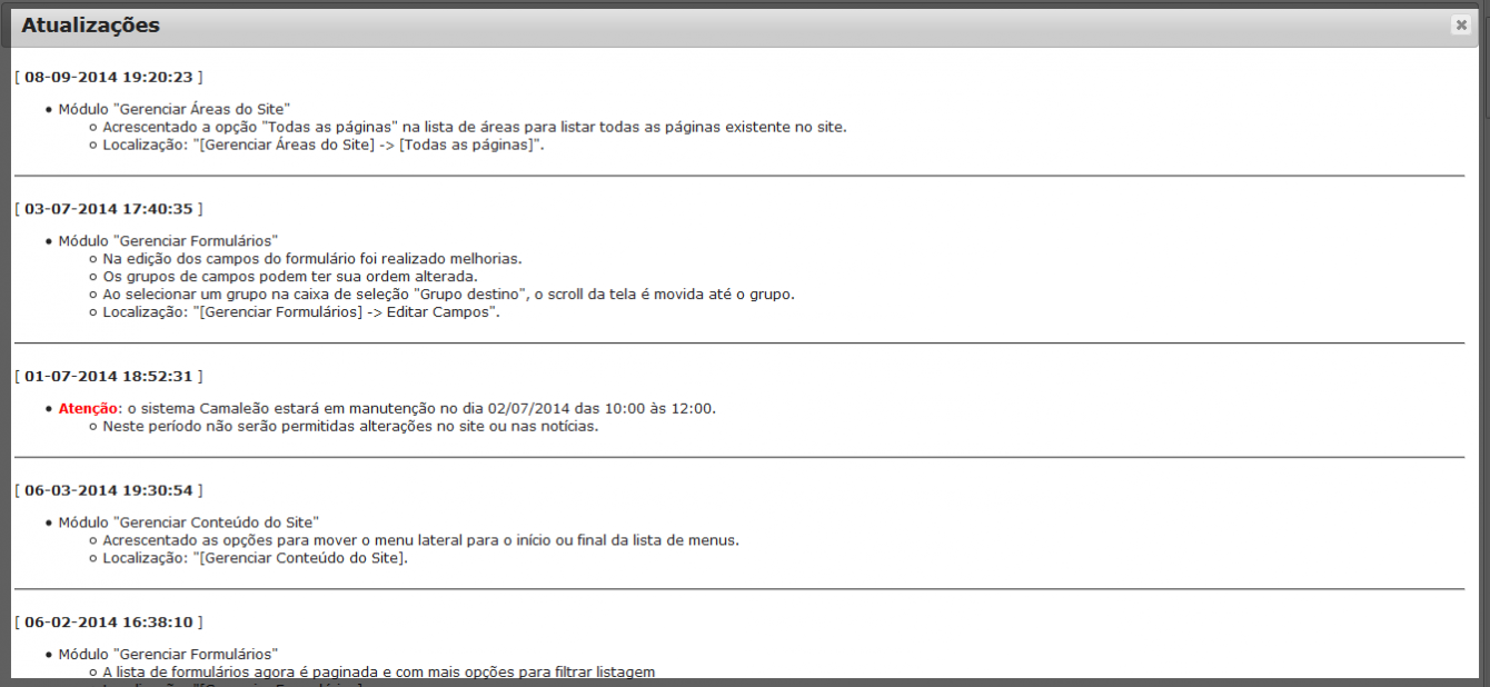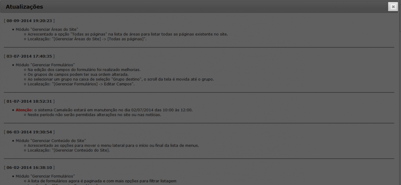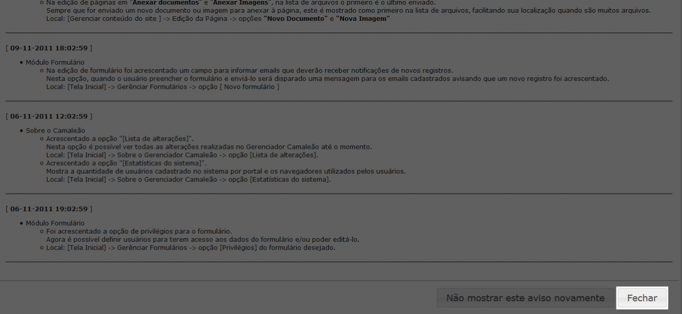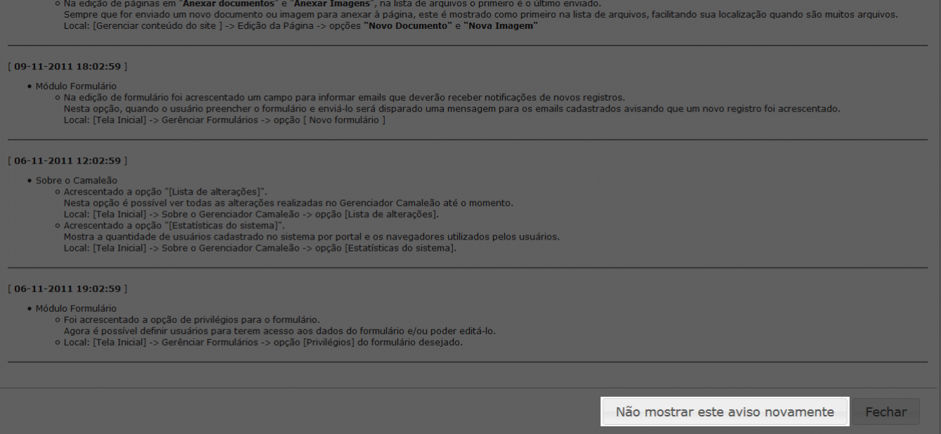O box com as últimas atualizações aparece em todo acesso ao sistema gerenciador. Para bloquear a exibição do box, clicar no botão “Não mostrar este aviso novamente”.