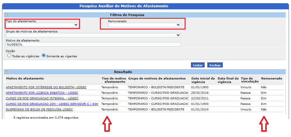 Motivo do afastamento selecione SUSPENSÃO DE BOLSA DE PESQUISA UDESC, utilizando a lupa para pesquisar.2. Botão Listar.3. Lista de afastamentos pesquisados;Confirmar/Alterar Data fim do Afastamento.Data Fim informe a mesma data fim cadastrada no afastamento, selecione Confirmar Retorno e clique no botão Alterar.