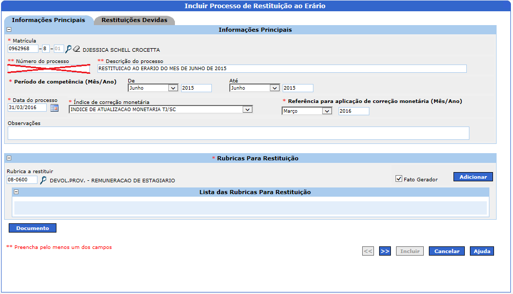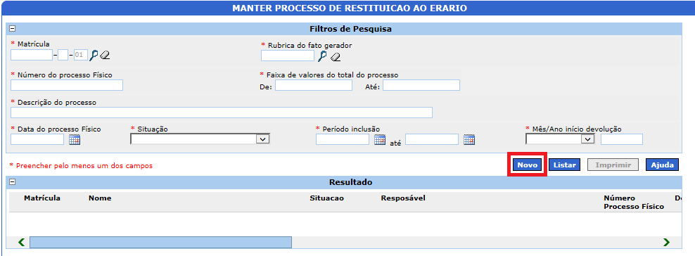1. Vá em MENU DO SISTEMA > PAGAMENTOS > RESTITUICAO AO ERARIO > MANTER PROCESSO DE RESTITUICAO AO ERARIO