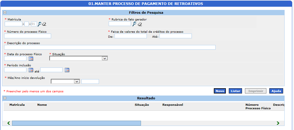 1. Vá em MENU DO SISTEMA > PAGAMENTOS > RETROATIVOS > MANTER PROCESSO DE PAGAMENTO DE RETROATIVOS