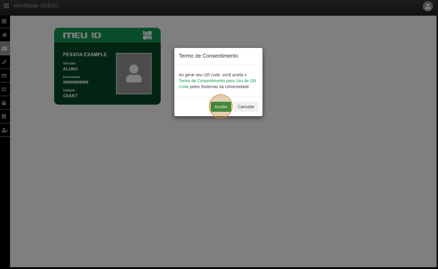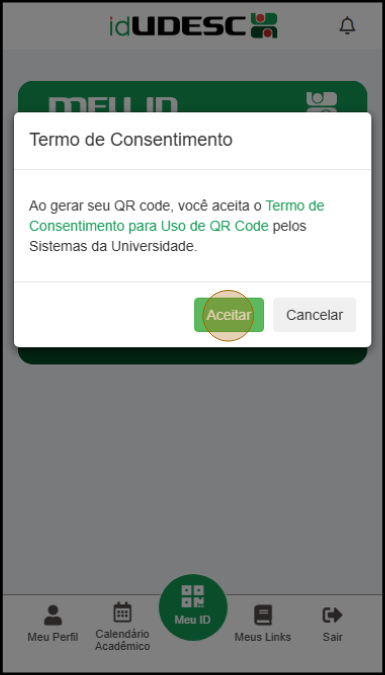 No primeiro acesso, o sistema vai pedir o aceite dos Termos de Consentimento para uso do QR Code pelos sistemas da UDESC.