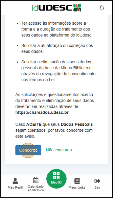 No seu primeiro acesso você precisa ler e concordar com o “Termo de consentimento para armazenamento e tratamento de dados pessoais em conformidade com a LGPD”.