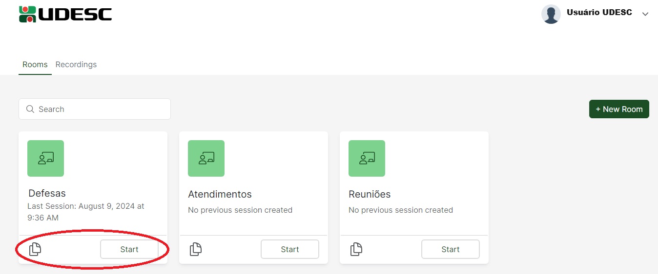 Na página inicial onde são apresentadas todas as salas (rooms), abaixo do nome de cada sala existe o ícone , ao clicar será copiado o link de acesso à sala que deverá ser compartilhado com os participantes da reunião. Ao lado o botão Começar (Start) inicia uma sessão de reunião na sala.