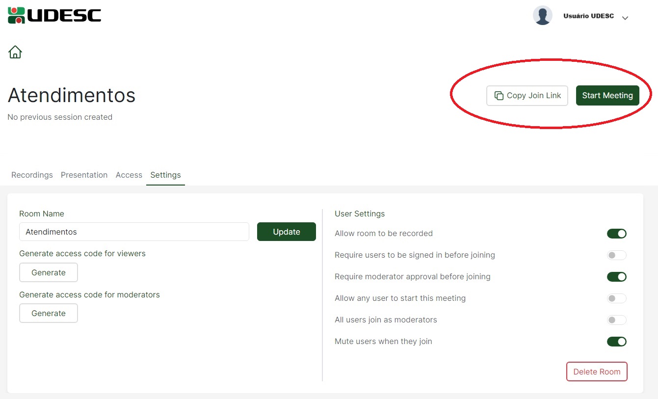 • Gerar código de acesso para moderadores (Generate access code for moderators): Ao clicar no botão gerar um código de acesso com permissões para moderação da reunião é criado. Ao acessar o link da sala o participante deverá informar este código para acessar como moderador da reunião.
