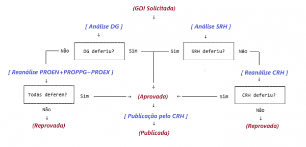Em caso de INDEFERIMENTO por parte do SRH ou DG, a solicitação é encaminhada, respectivamente, à Coordenadoria de RH (CRH) ou às Pró-reitorias(PROEN, PROEX e PROPPG) para reanálise.
